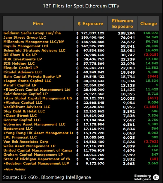高盛成为以太坊ETF最大机构持有者,Jane Street与Millennium紧随其后