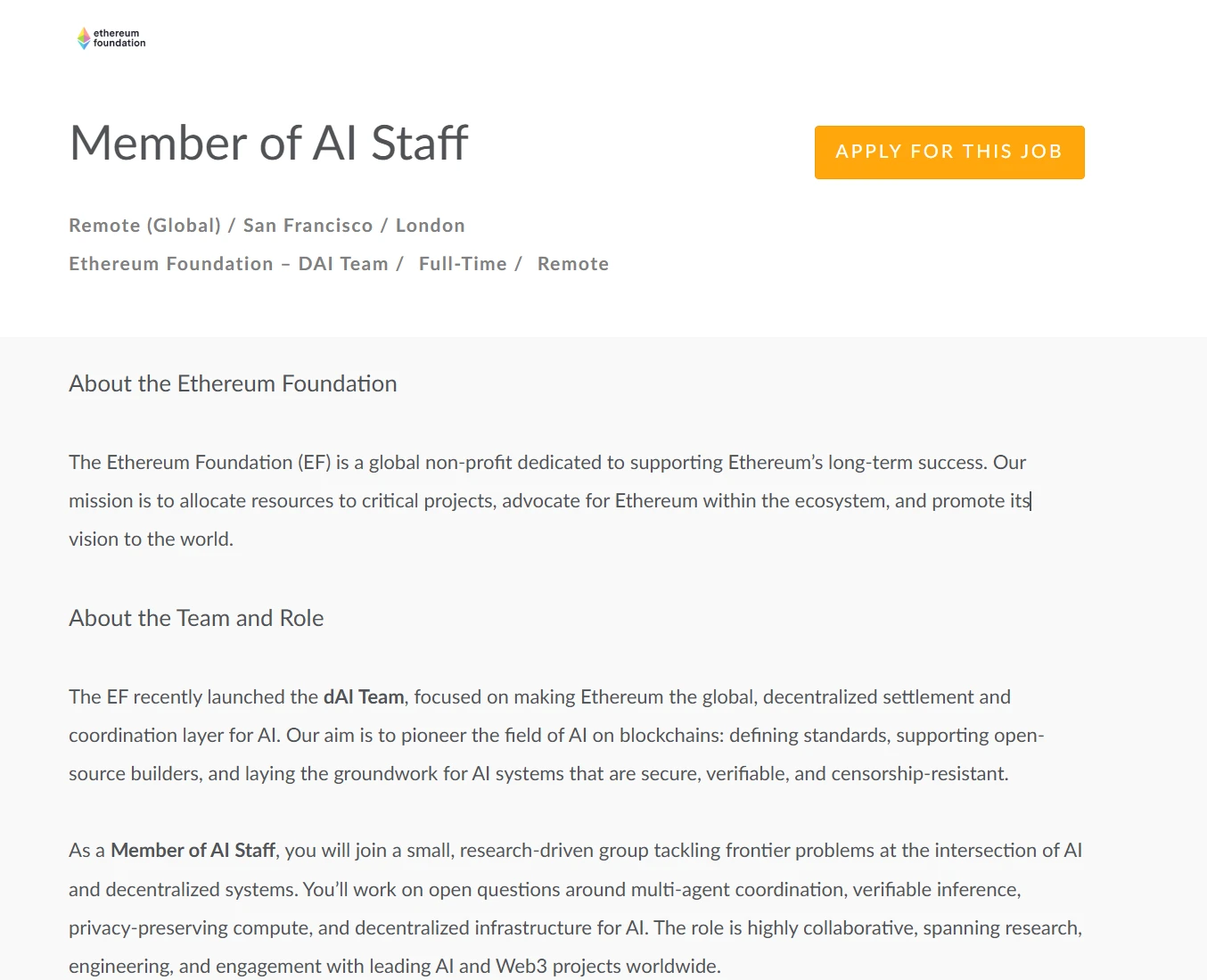 以太坊基金会启动DAI团队AI岗位招聘,推动链上AI发展