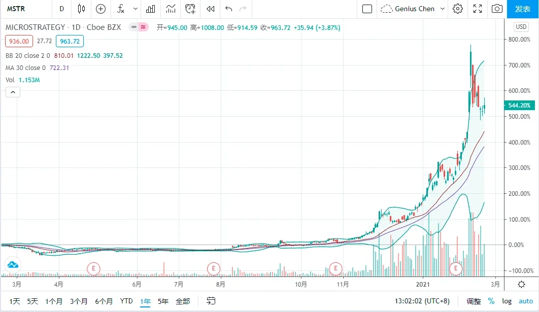 MicroStrategy自2020年起持续加仓比特币,截至2021年2月,其比特币持仓已达71,079枚,总成本约11.45亿美元,账面浮盈超过28亿美元。该公司通过发行可转换债券募集9亿美元用于进一步增持比特币,显示出其将比特币视为核心资产配置的坚定立场。MicroStrategy的股价在投资比特币后大幅上涨,MSTR一年涨幅达544.2%,反映出资本市场对其战略的认可。该公司的策略不仅提升了比特币的机构持有比例,也增强了市场对其作为数字黄金的共识。