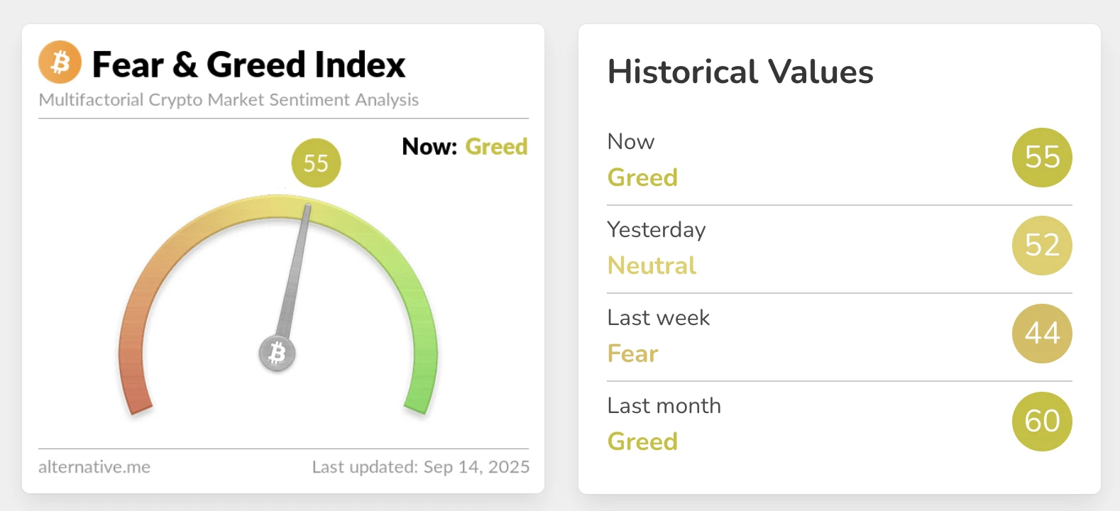 加密货币恐慌与贪婪指数升至55,市场情绪转为贪婪