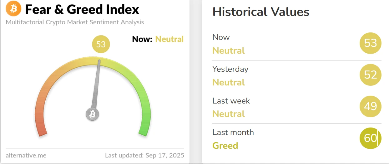 加密货币恐慌与贪婪指数小幅攀升至53 市场情绪维持中性