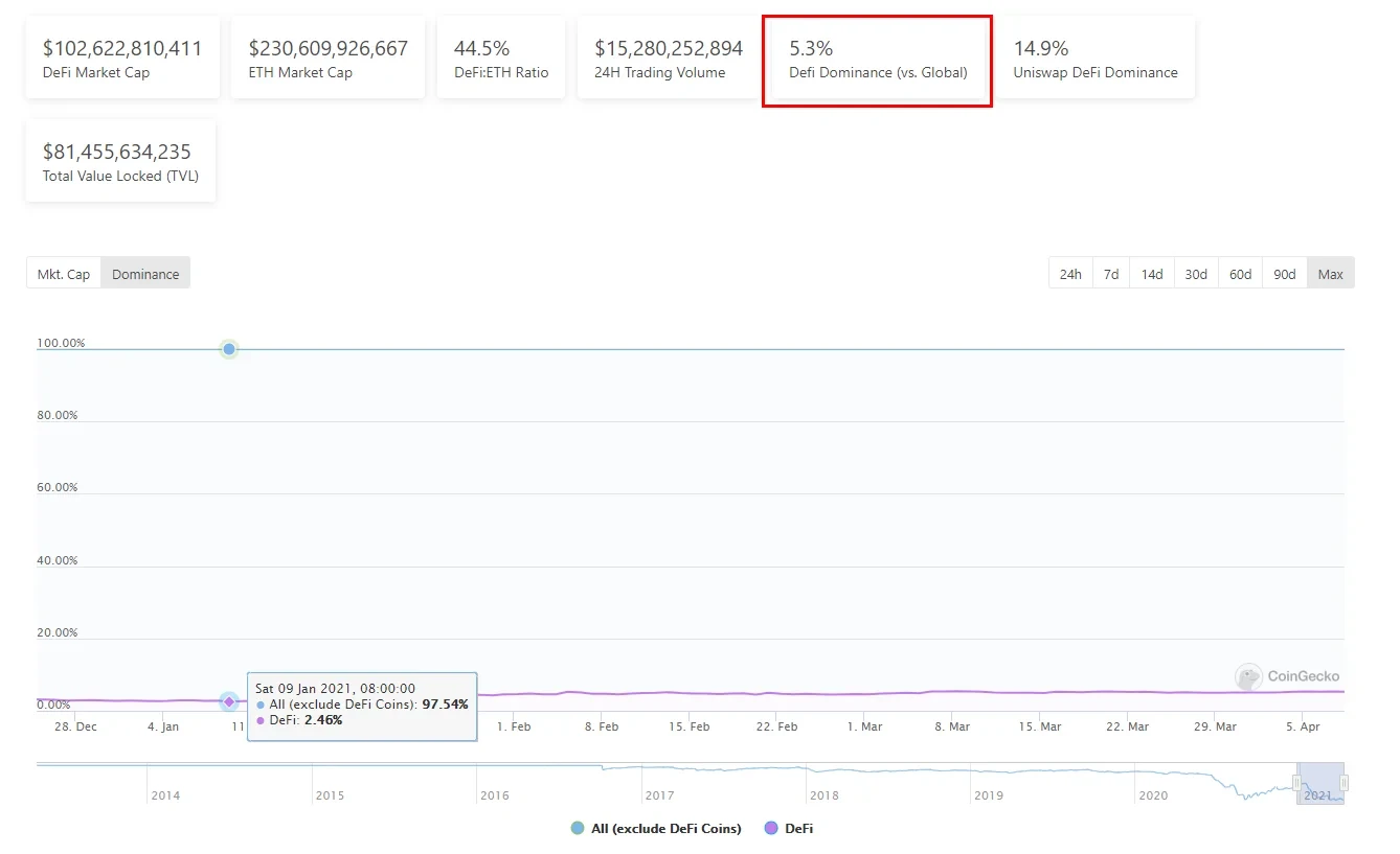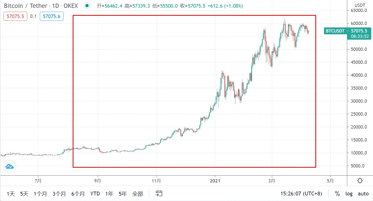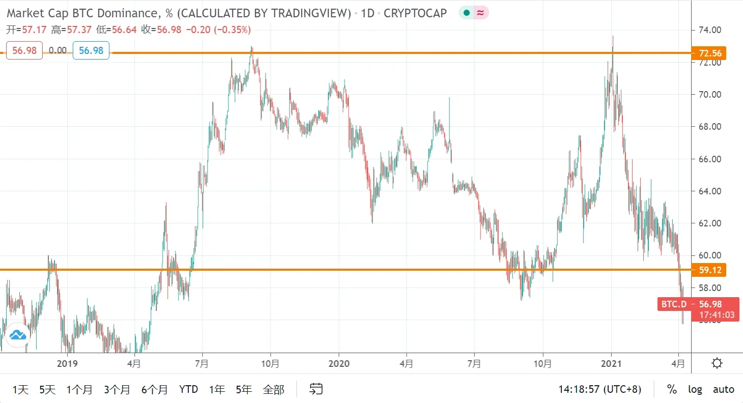 2021年4月,加密货币总市值突破2万亿美元,较年初增长163%,较上一轮牛市峰值(8500亿美元)增长近140%。这一里程碑标志着加密资产从边缘资产向主流资产的过渡。比特币市值突破1万亿美元,占整体市值的54%,以太坊紧随其后,占比12%。前五大加密货币合计占据73%的市场份额,显示出市场集中度依然较高,但资金开始向中长尾资产扩散。