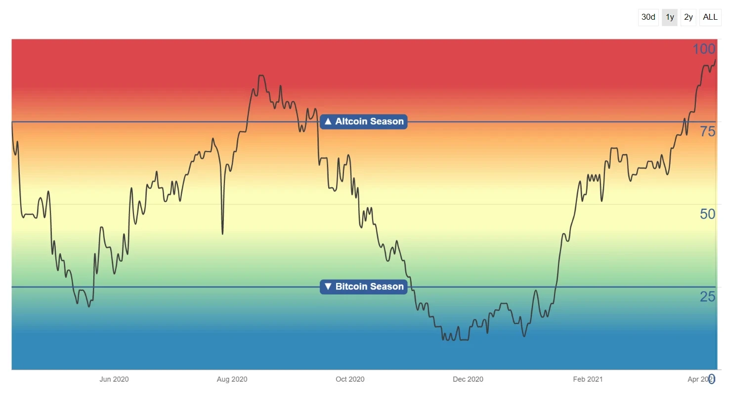 根据Blockchain Center的定义,若前50名代币中有75%在90天内表现优于比特币,则标志着“山寨币季”开启。数据显示,2021年第一季度,多数中型市值代币涨幅显著,OKT、KSM、DOT等项目涨幅超过500%。这种结构性轮动反映出市场风险偏好上升,资金从龙头资产向高成长性项目转移,推动整体市值进一步扩张。
