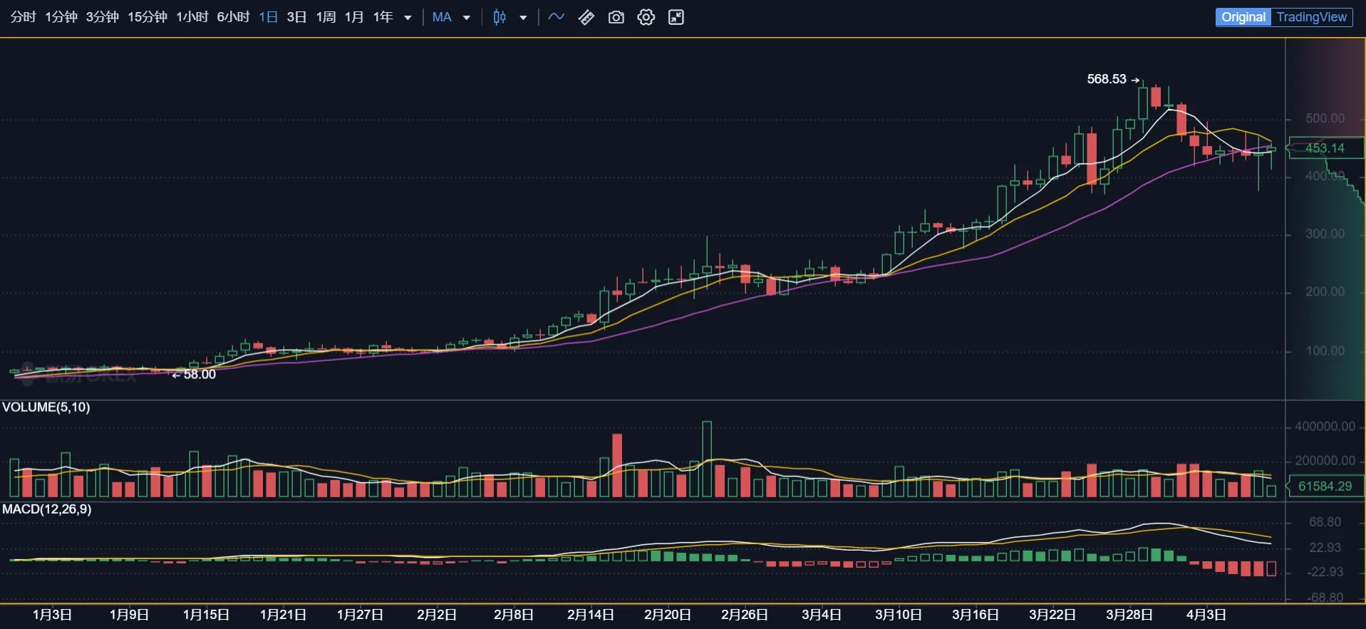比特币近期出现明显回调,4月7日最低跌至55,611.7 USDT,日线级别呈现两连阴走势。短期来看,市场多头动能减弱,技术面出现调整信号。然而,从更长期视角观察,比特币仍维持在高位震荡区间,表明市场整体情绪并未转向悲观。链上数据显示,大额转账笔数和链上活跃地址数仍处于历史较高水平,反映出机构与高净值投资者的持续参与。